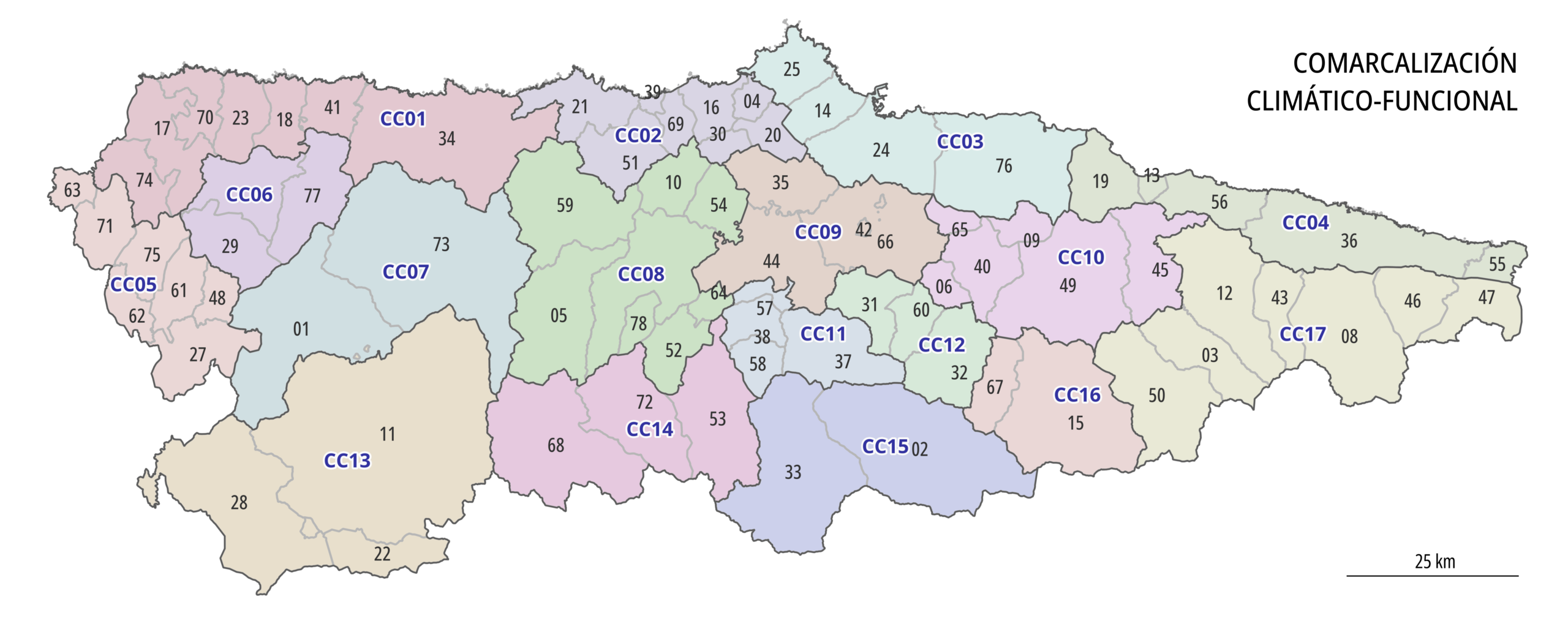 Las 17 comarcas climático-funcionales, cuya identificación se realizó empíricamente y a criterio experto, incorporando la visión del equipo interdisciplinar de investigación. Como base de partida se toma la división municipal y el esquema de zonas de predicción meteorológica de AEMet (METEOALERTA, v6), complementado con criterios geográficos, socioeconómicos y administrativos, considerando varias divisiones sectoriales, entre ellas: comarcas/subcomarcas funcionales (DROT), comarcas agrarias, zonas agroganaderas (SADEI), comarcas forestales, comarcas turísticas y partidos judiciales.