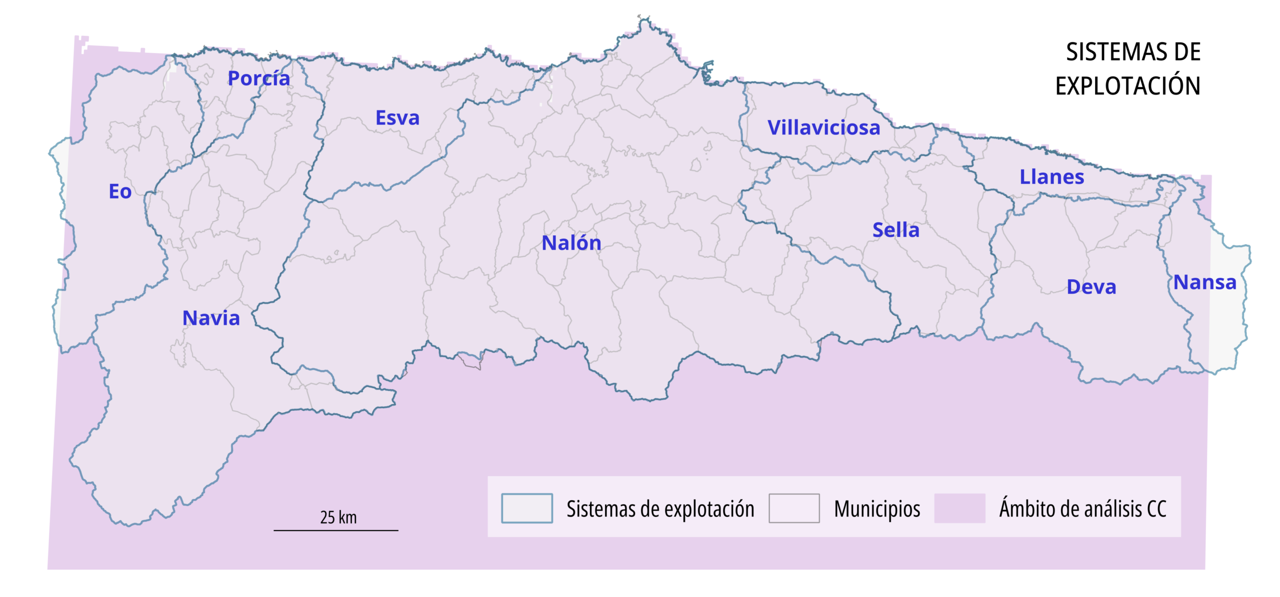 Los 10 sistemas de explotación (Eo, Porcía, Navia, Esva, Nalón, Villaviciosa, Sella, Llanes, Deva y Nansa) son los definidos por la Demarcación Hidrográfica del Cantábrico Occidental de la Confederación Hidrográfica del Cantábrico, y se incorporan al análisis a propuesta de la Dirección General del Agua del Principado de Asturias, precisamente porque son unidades de referencia para planificación y gestión de los recursos hídricos.